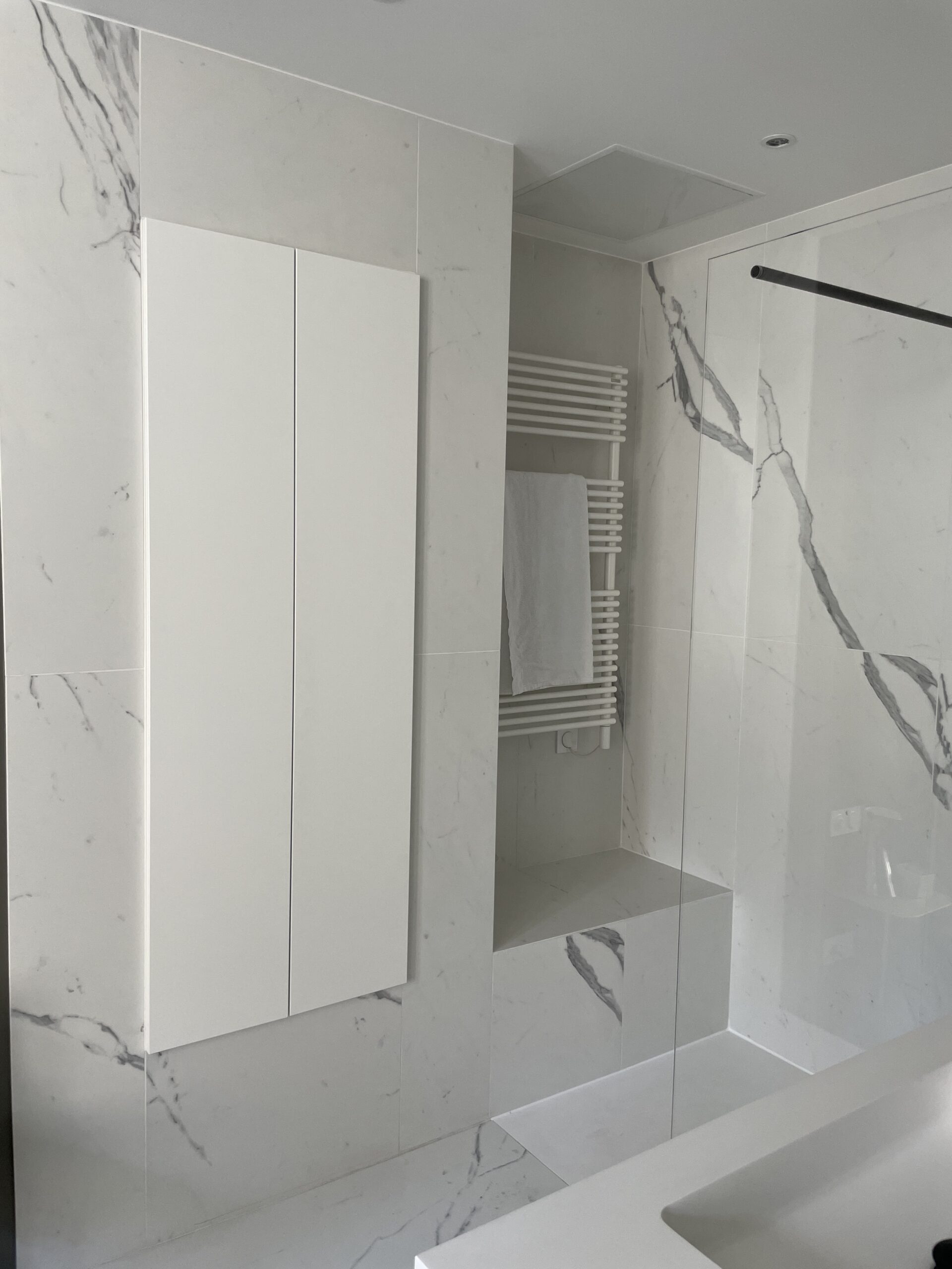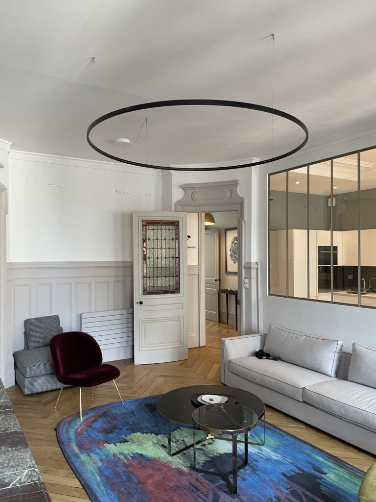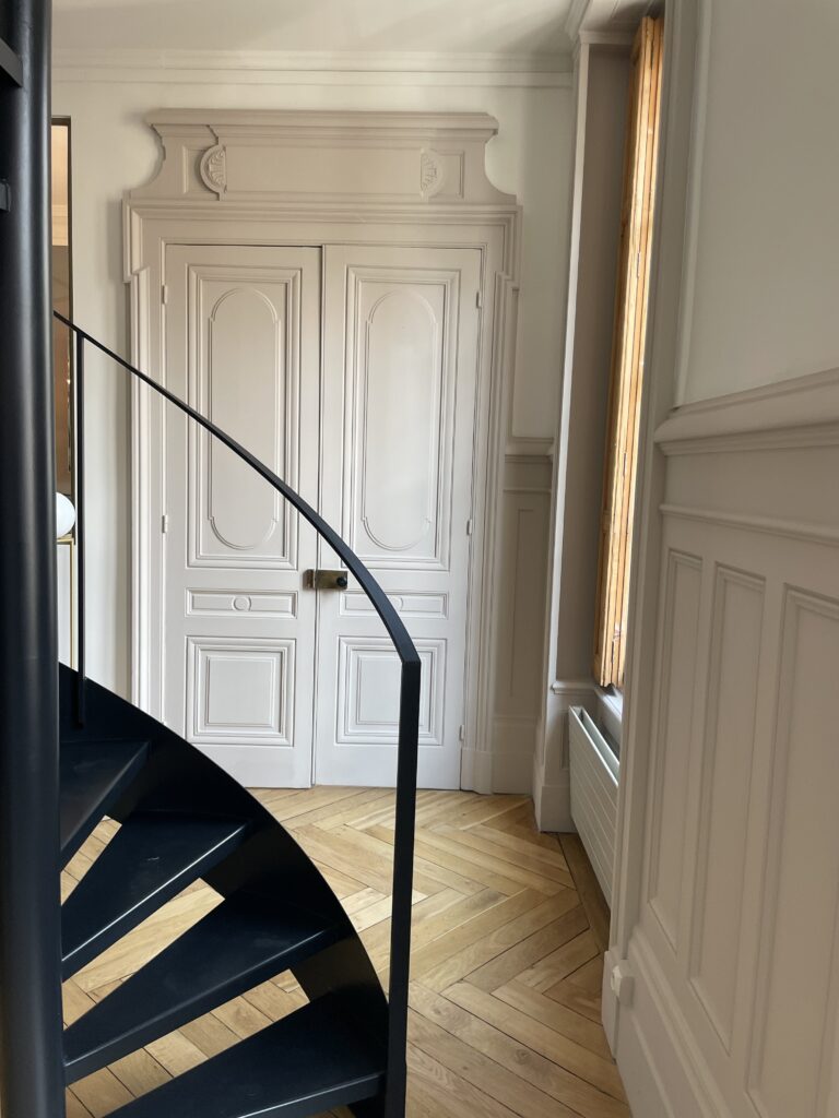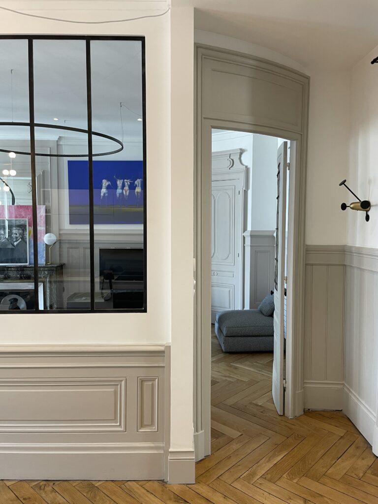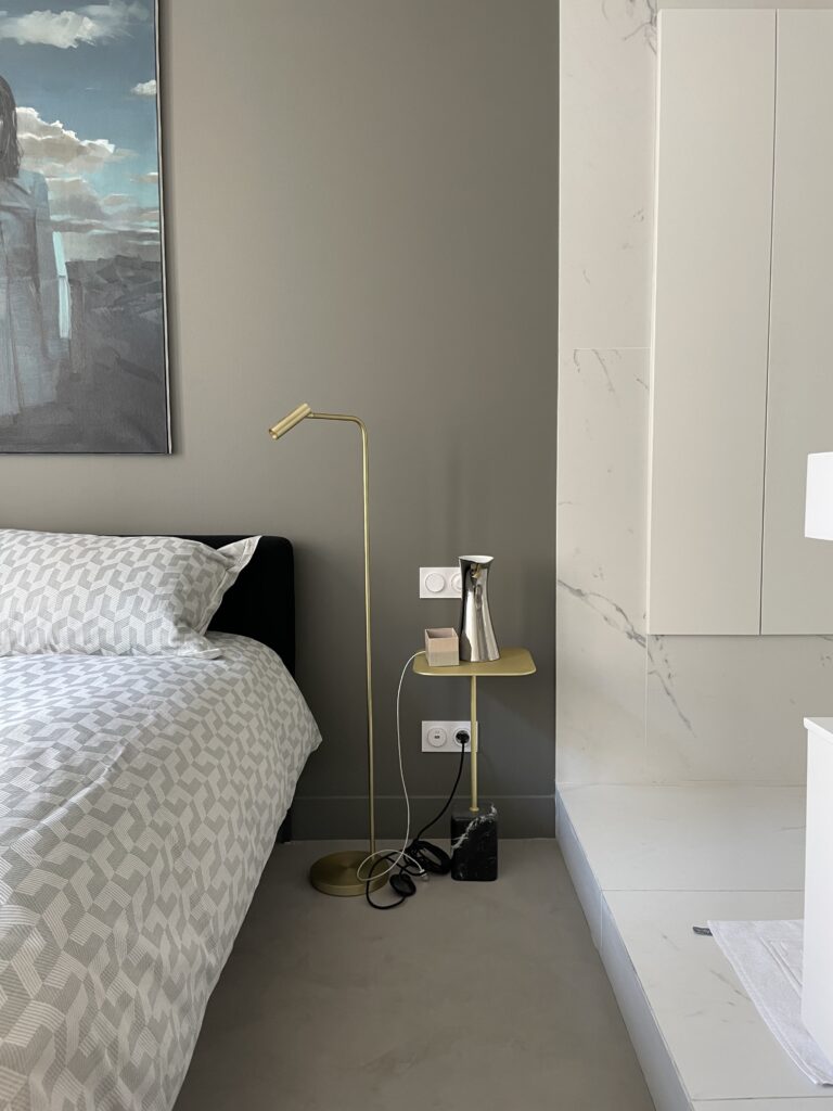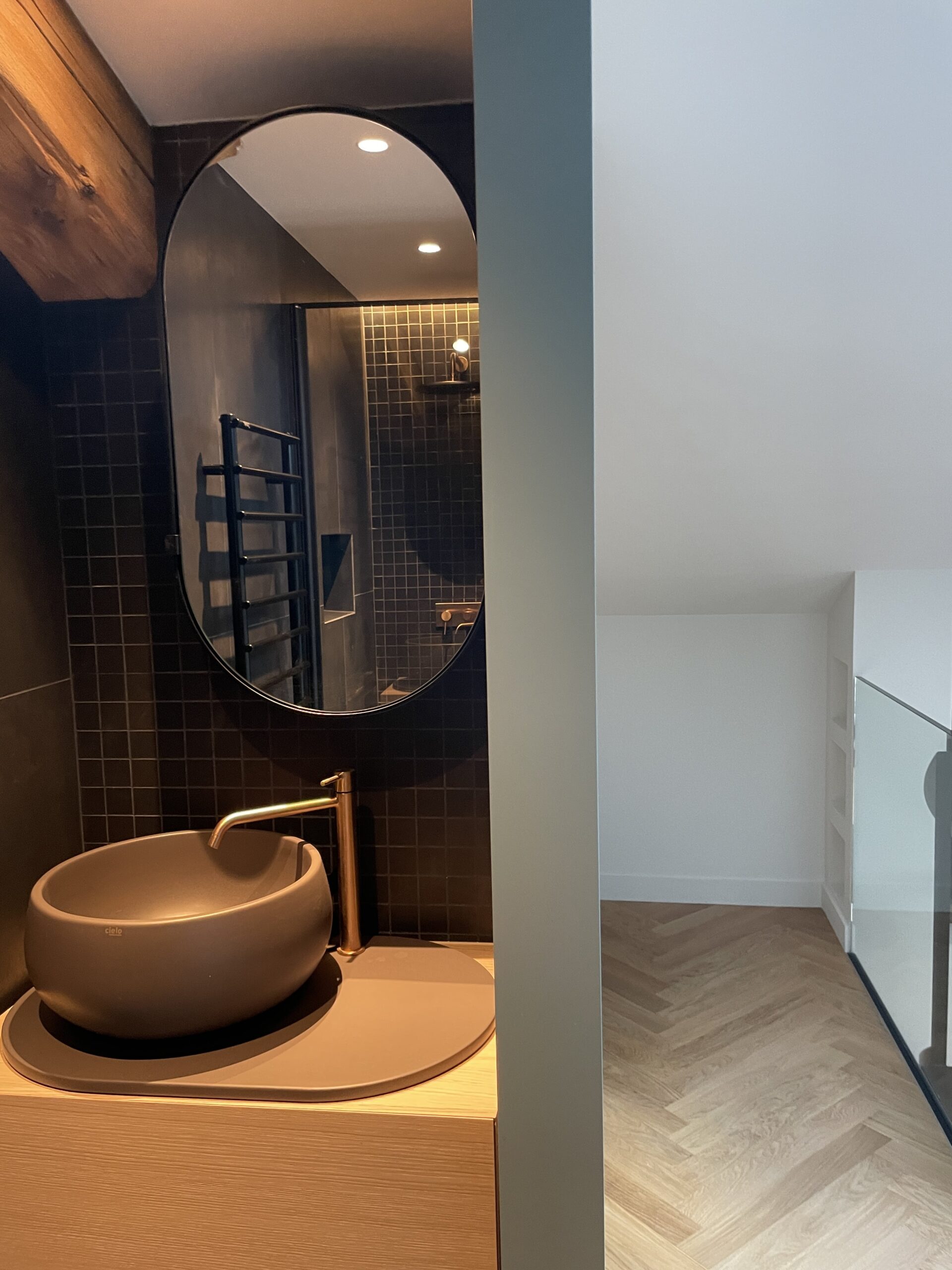 Aménagement de comble, avec création d'une trémie et reprise et sous oeuvre. Création d'une suite parentale avec isolation complète des combles, douche à l'italienne, ensemble meuble vasque CIELO, robinetterie GESSI, radiateurs TUBES, cabine de douche SUR MESURE et carrelage de chez PLATTARD, dressing sur mesure, parquet de chez GAGNEU, appareillage électrique MELJAC, luminaires XAL, garde corps en verre sur mesure. (Mise en place d'un escalier en partenariat avec ESCALIERS DECORS)