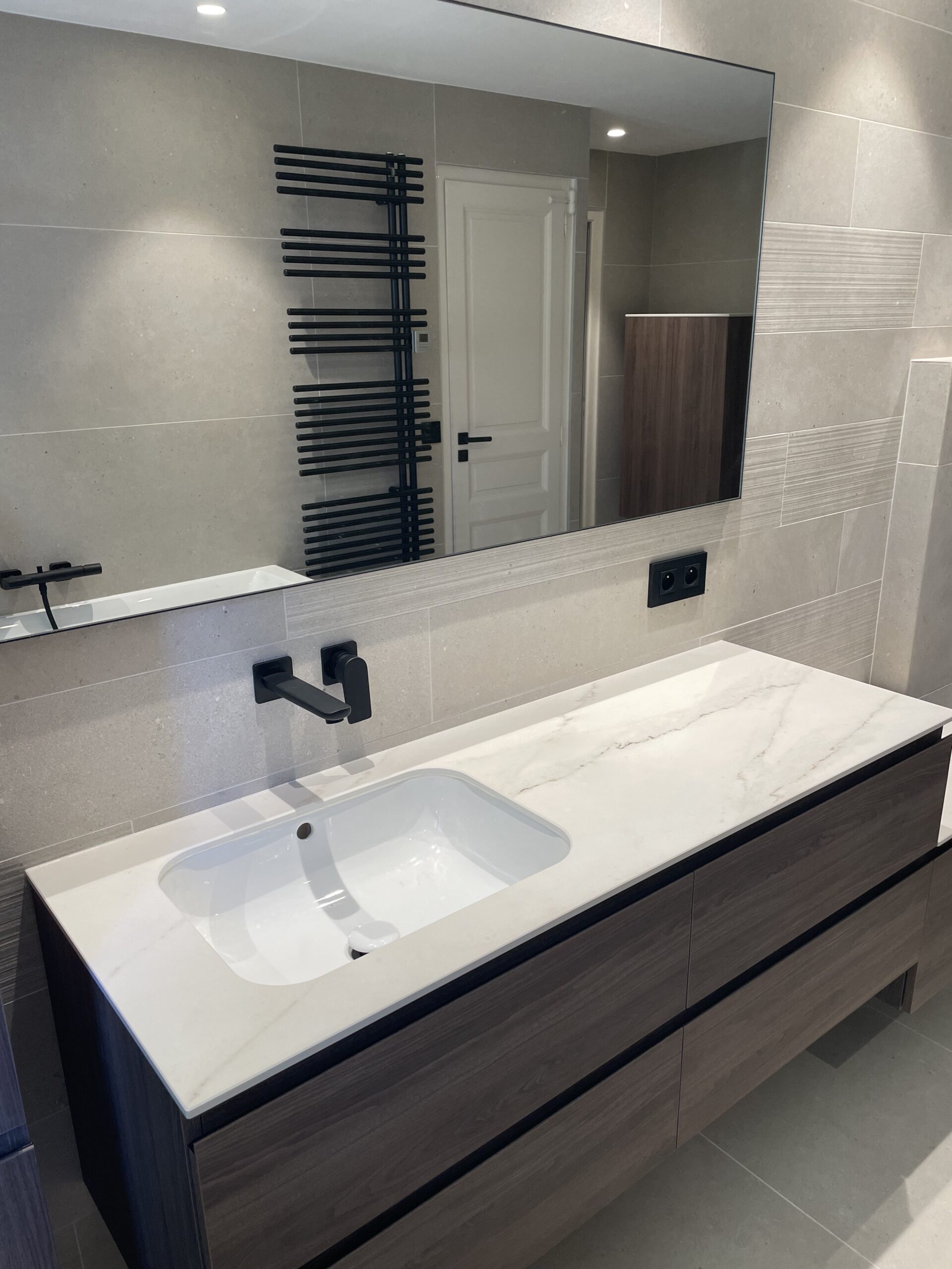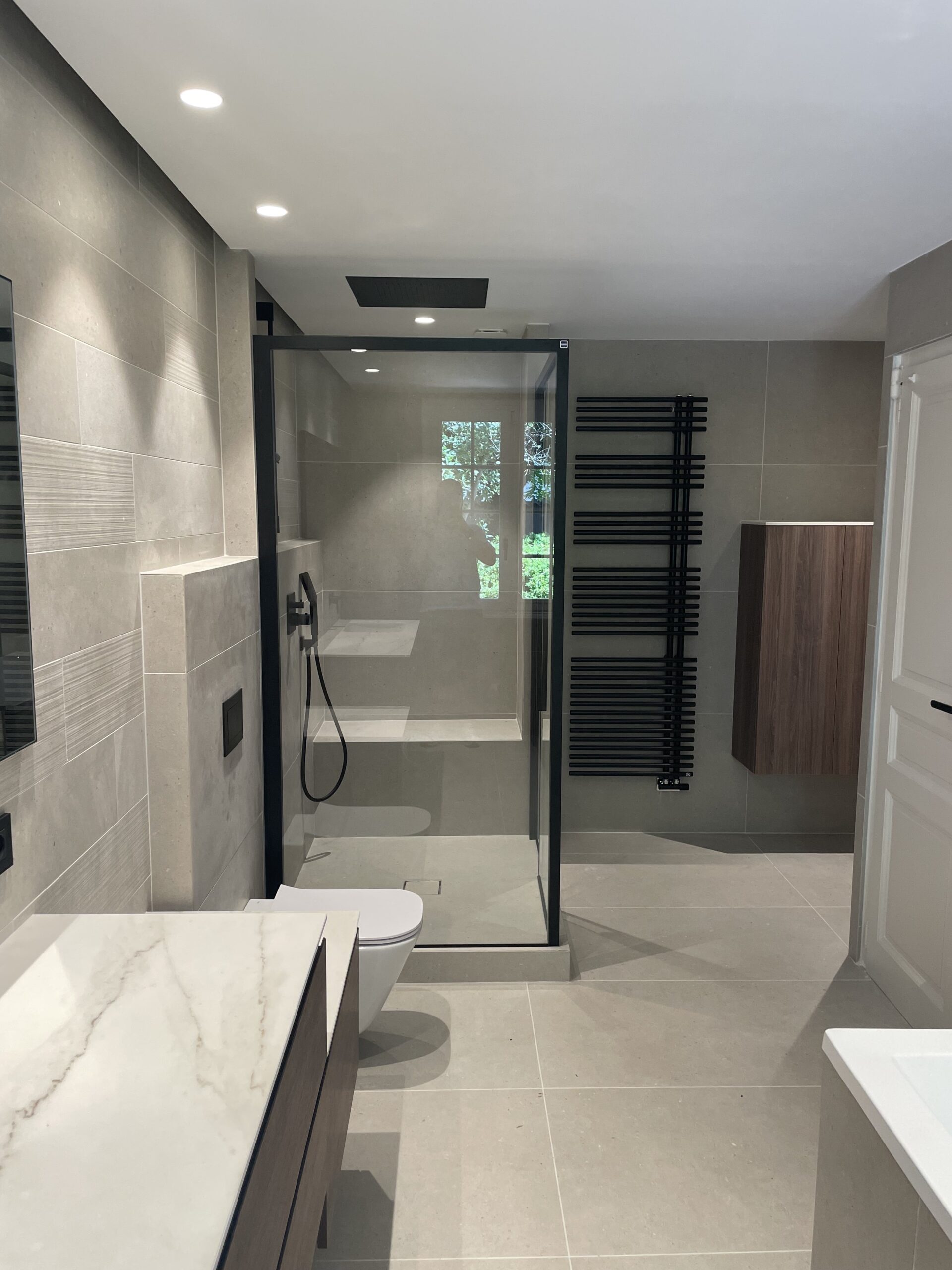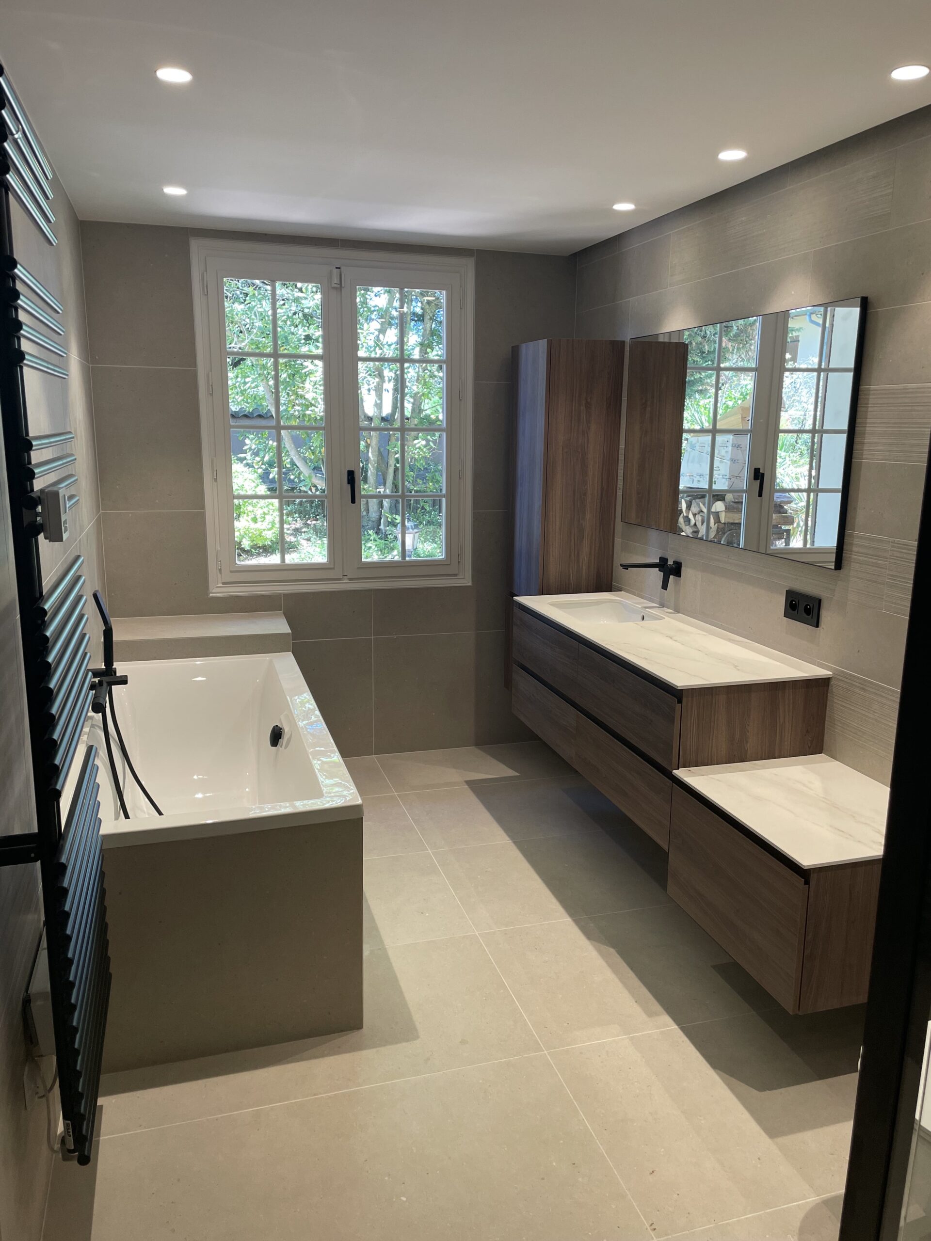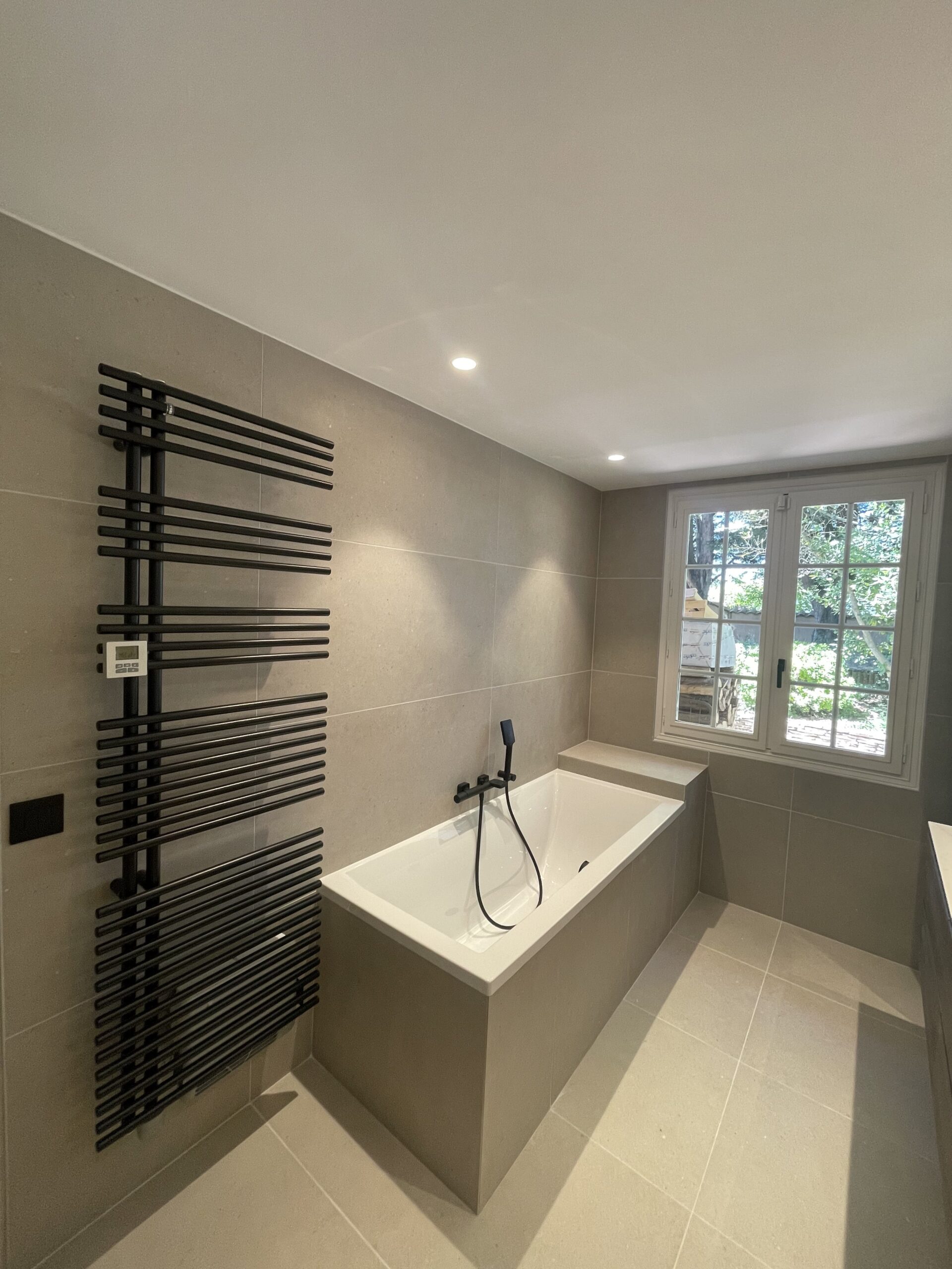 Rénovation d'une salle de bain avec douche à l'italienne (avec assise), baignoire e acrylique RIHO, plan vasque sur mesure en DEKTON, mobilier IDEAL BAGNI en HPL, robinetterie GRAFF, toilette ROCA, radiateurs IRSAP, cabine de douche SAMO et carrelage de chez PLATTARD, Dressing sur mesure, placage EGGER quincaillerie BLUM