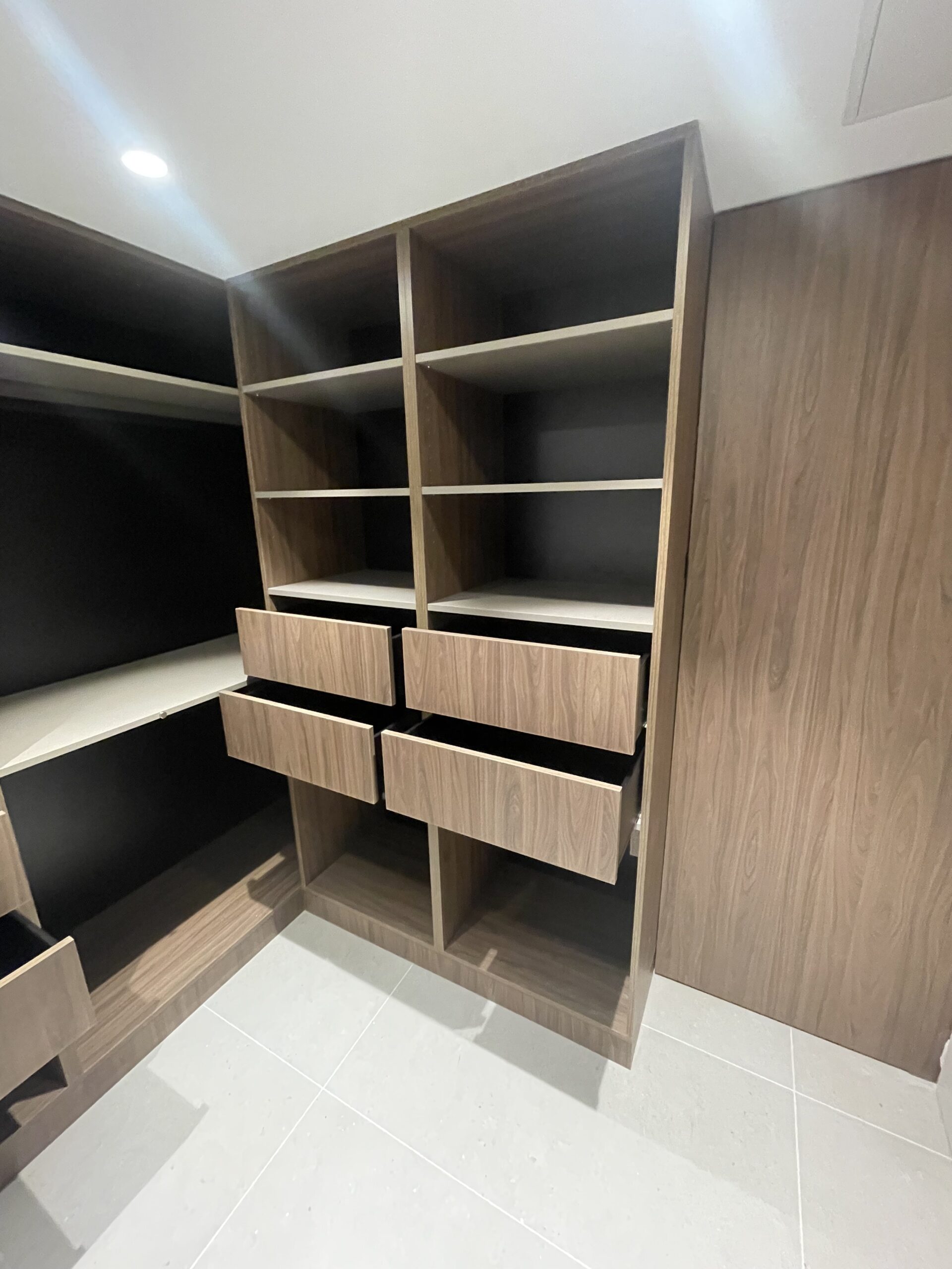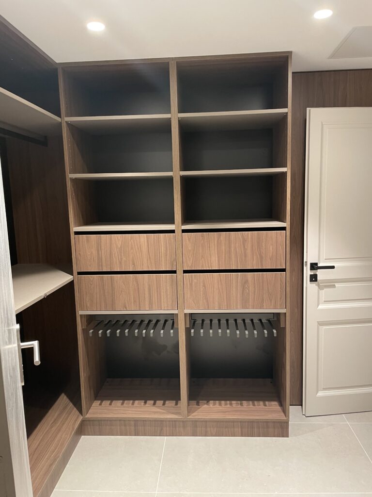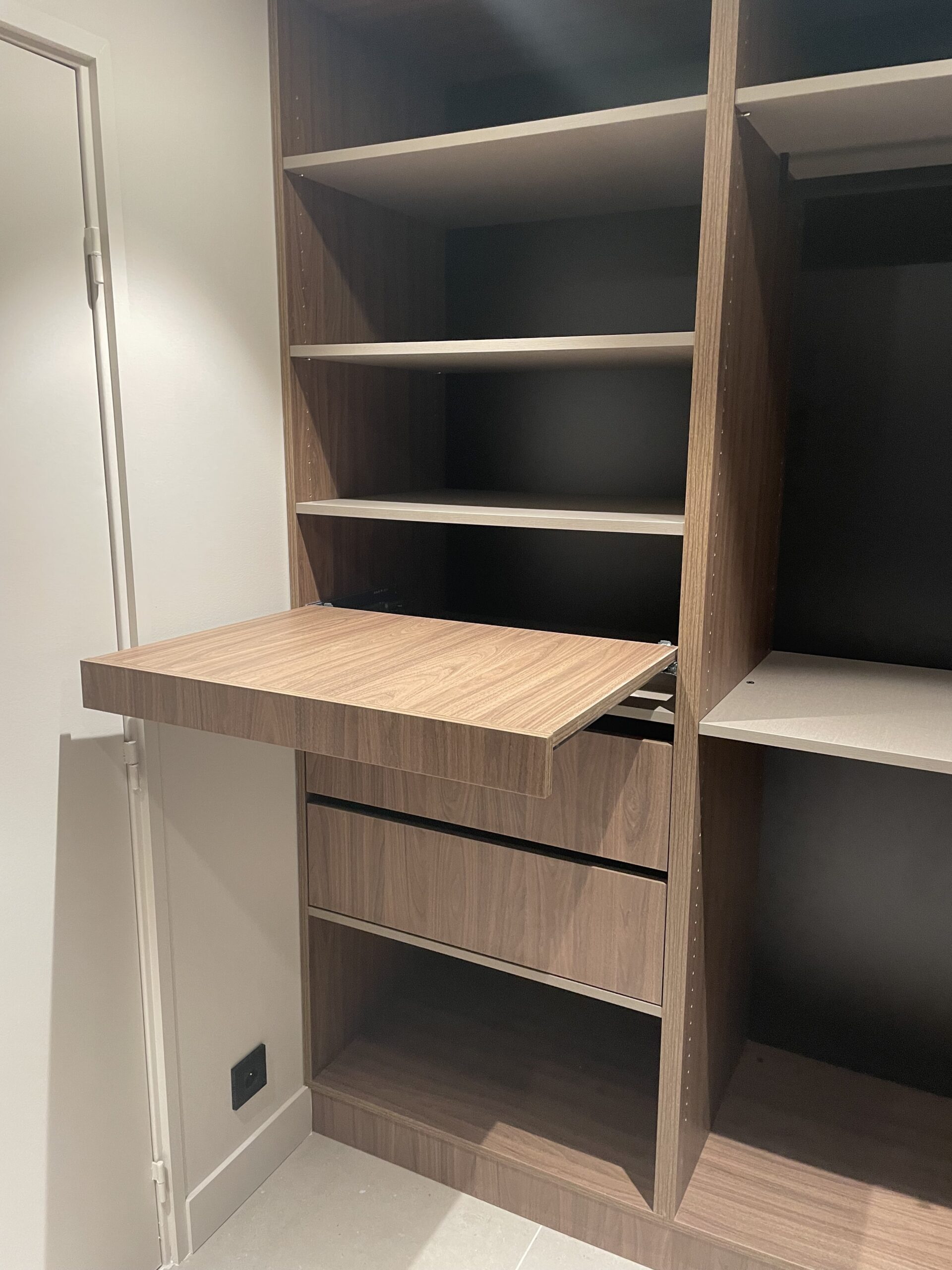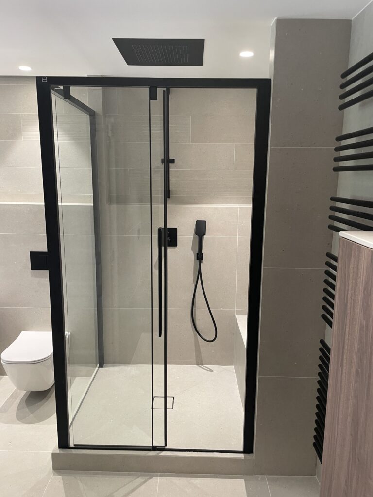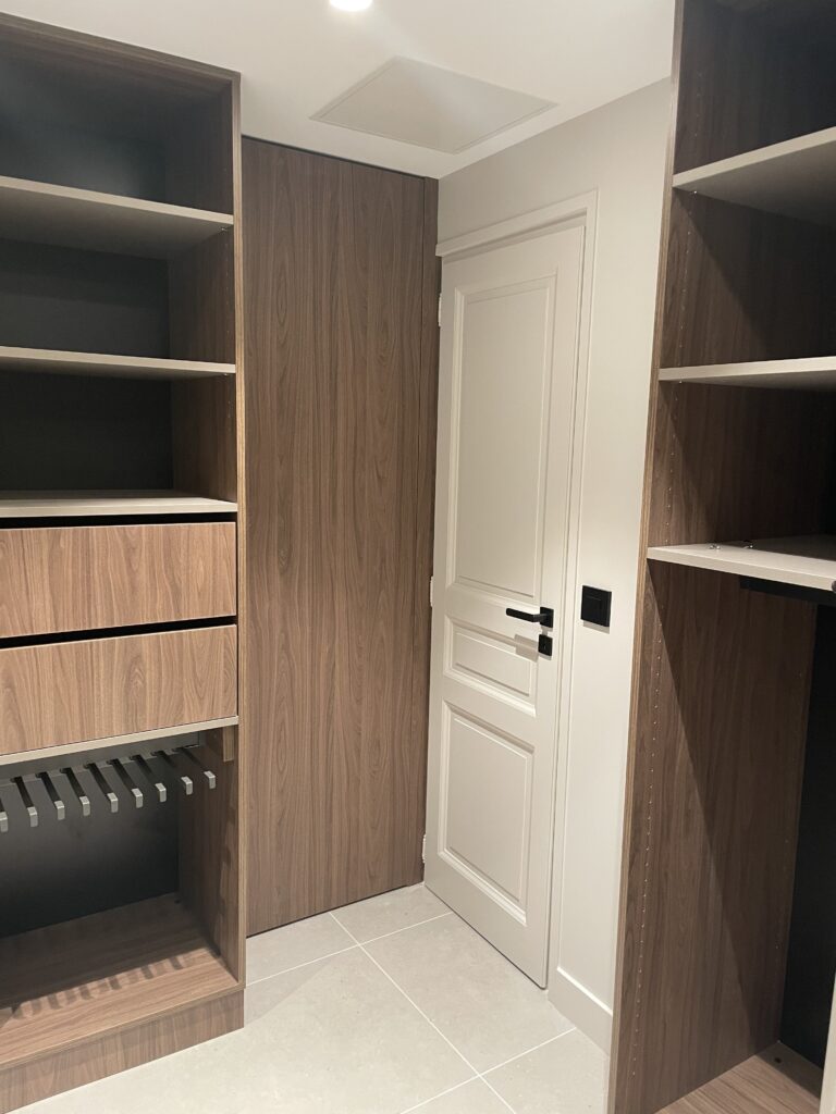Rénovation d'une salle de bain avec douche à l'italienne (avec assise), baignoire e acrylique RIHO, plan vasque sur mesure en DEKTON, mobilier IDEAL BAGNI en HPL, robinetterie GRAFF, toilette ROCA, radiateurs IRSAP, cabine de douche SAMO et carrelage de chez PLATTARD, Dressing sur mesure, placage EGGER quincaillerie BLUM