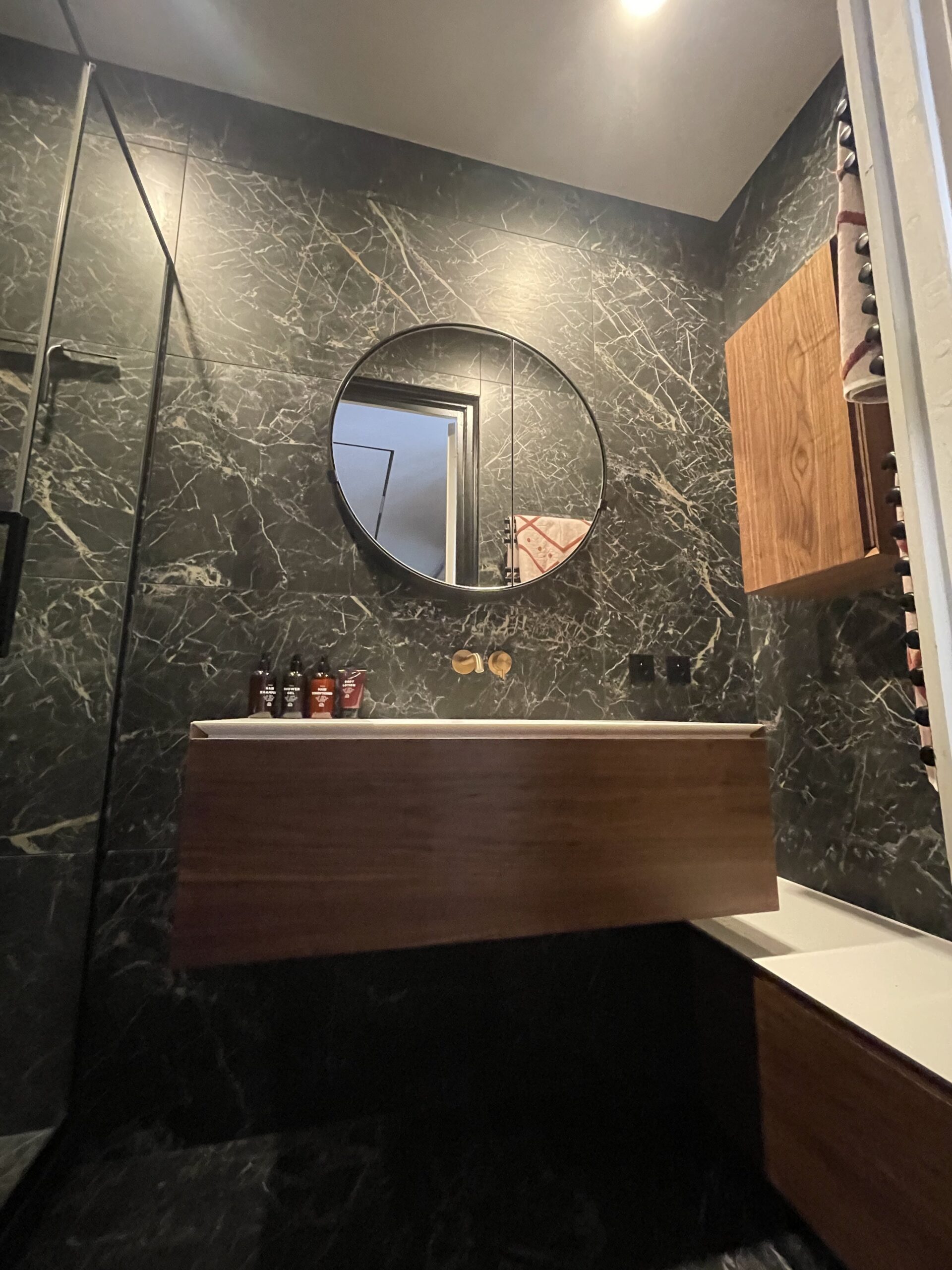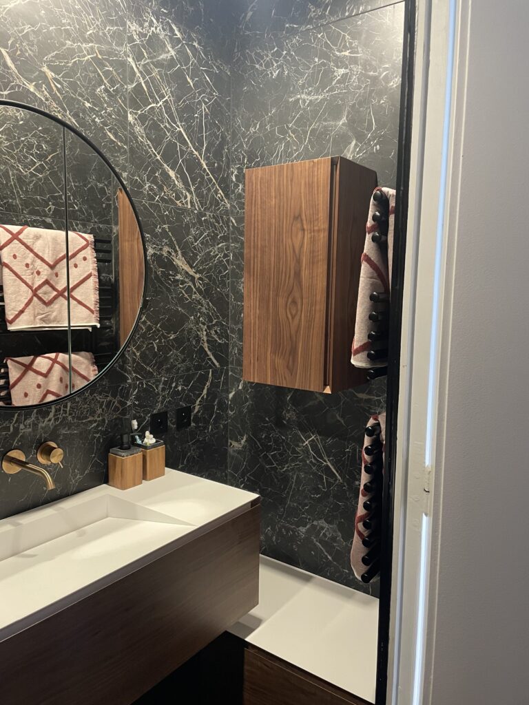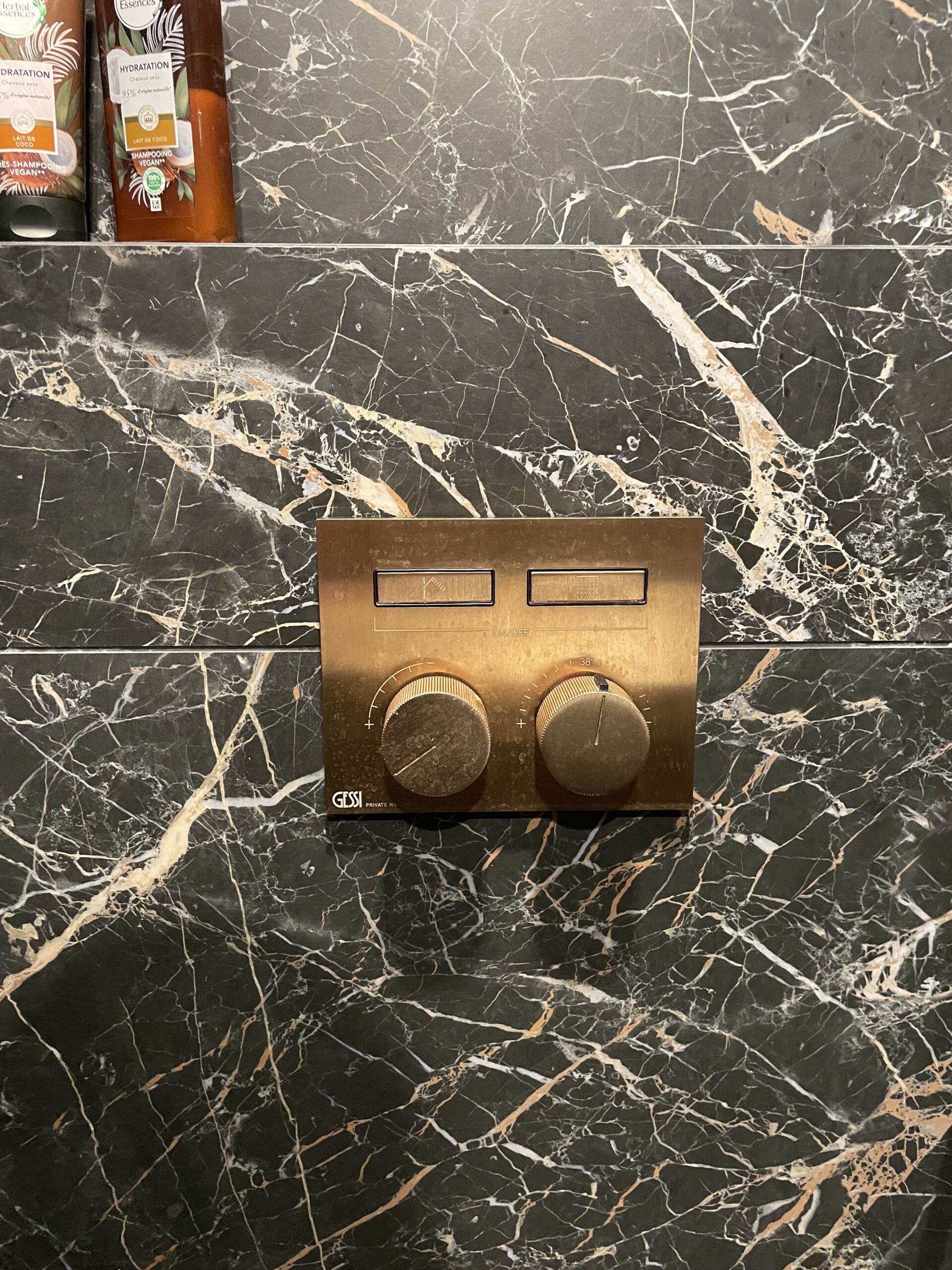 Salle de douche avec douche à l'italienne, plan vasque sur mesure en marbre de synthèse MOMA, mobilier en placage NOYER, robinetterie GESSI finition PVD, radiateur TUBES, cabine de douche sur mesure et carrelage aspect marbre de chez PLATTARD